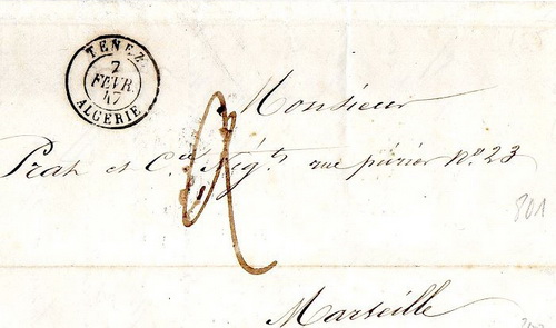 Lettre expédiée du Bureau de Poste Militaire de Ténès en 1847 pour Marseille, 2 centimes payés par l'expéditeur, écrit à la main (les timbres vont arriver en 1849) document de l'auteur. BIBLIOGRAPHIE et crédit photos : Le site Ténès info, site Ecole Militaire d'Infanterie Cherchell, doc GCPA, Delcampe, Esso Algérie et doc. De l'auteur Documentation : Guy Amand (2013) |