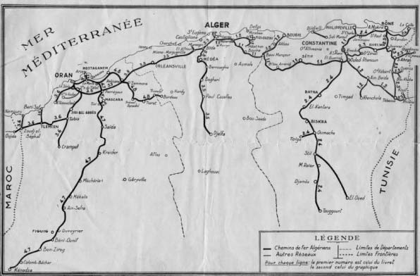 carte des principales lignes de chemin de fer en Algérie, années 50.