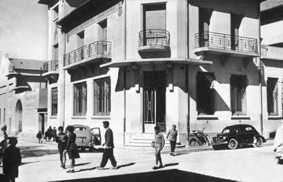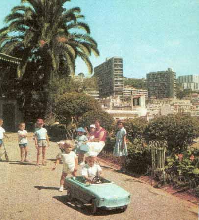 scéne de l'Algérie heureuse à Alger, au fond on aperçoit des immeubles HBM (Habitations à Bon Marché).