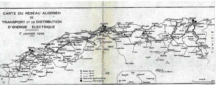 Il y a 11 compagnies d'électricité en Algérie au début du 20éme siécle, la plus importante est la Cie Lebon, le tout est nationalisé et l'E.G.A est créée en 1947. En 1950, on compte 25 centrales thermiques, dont 6 grosses installées sur les quais d'Oran, Alger et Bône. 27 barrages hydro-électriques, petits, moyens et gros, certains sont polyvalents ( irrigations des terres et alimentation d'eau de villes et villages ).