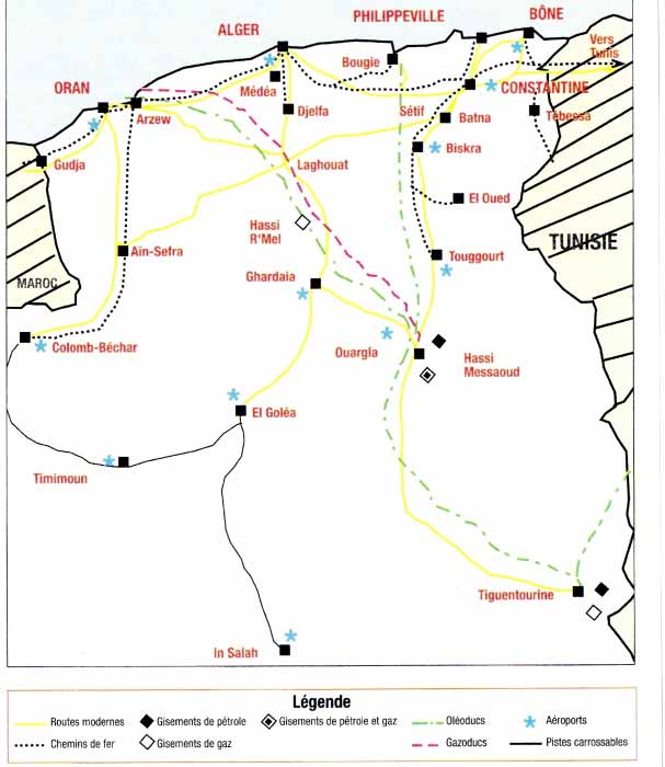 3 grands aéroports, Alger,Oran et Constantine. 1.000.000 de voyageurs. de nombreux aérodromes de moyenne importance, sans compter les bases militaires créées à partir de 1955 ( ex : Boufarik, la plus grosse base d'hélicos du pays, Aïn-Arnat grosse base de l'ALAT etc....) 1 compagnie aérienne, Air Algérie, créée en 1945.( avec 10 DC3 pour commencer, 10 DC4 en 1954, 2 Constellations en 1955, 3 Noratlas en 1959 et 6 Caravelles en 1960 ). 53 aéro-clubs et 460 avions privés