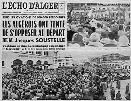 ...Accueilli avec suspicion par les français d'Algérie, Jacques Soustelle évolue vers des conceptions « Algérie française » cependant il est remplacé par Robert Lacoste au poste de Gouverneur.